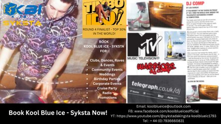 Kool Blue Ice - Syksta is delighted to be a European DJ Champion & Finalist for Tour Music Fest 2025, a Warriors DJ National Finalist, a Movida Corona DJ Champion, and Telegraph Nationwide 2005 DJ Champion as well as both securing residencies and playing at a selection of high profile events including: